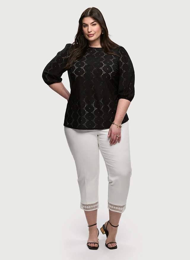 Embroidered Bouffant Sleeve Blouse & Lace-Hem Denim Capris