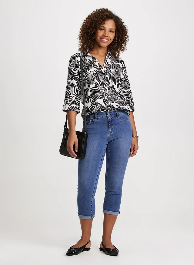 Palm Print Button Down Blouse & Decorative Buttons Pull-On Jeans