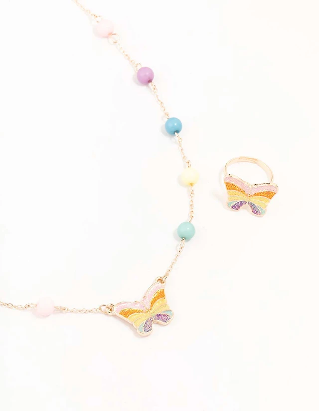 Kids Rainbow Gold Butterfly Necklace & Ring Pack