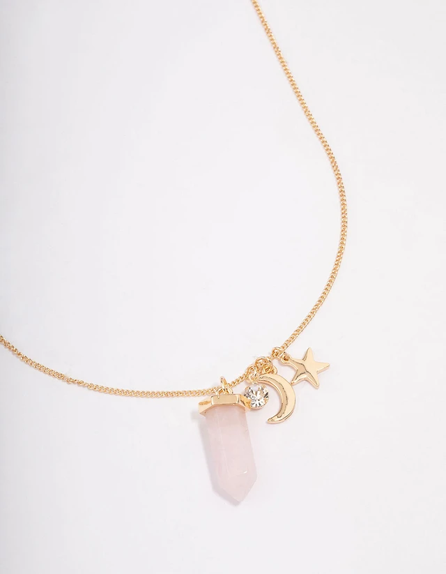 Gold Rose Quartz Moon & Mushroom Pendant Necklace