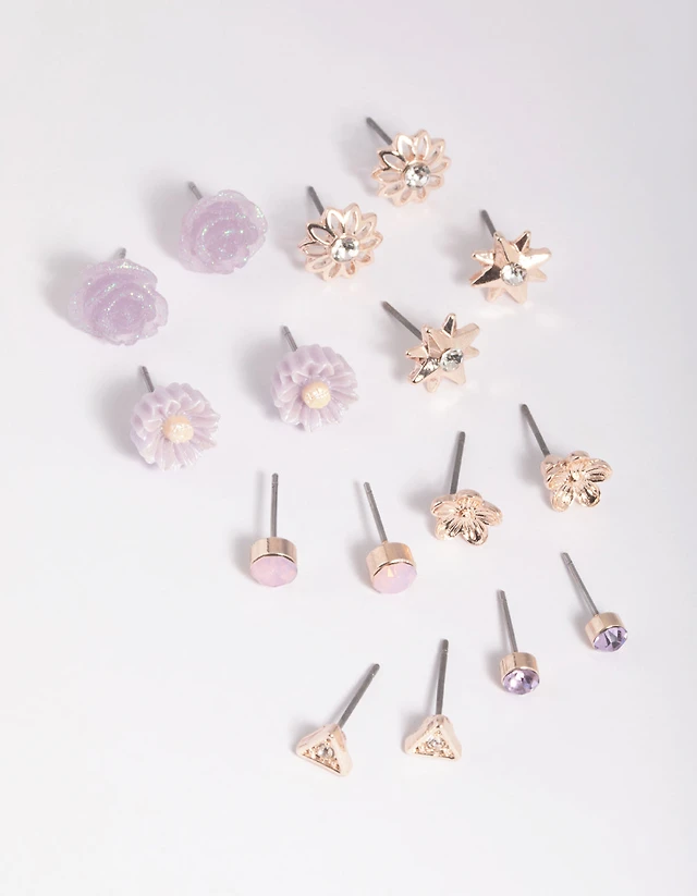 Rose Gold Diamante Mixed Shape Stud Earrings 8-Pack