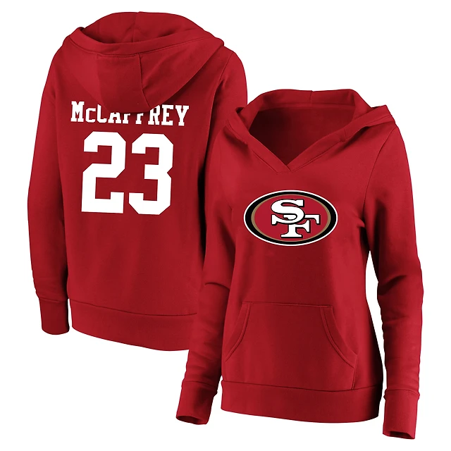 Women's Majestic Threads Christian McCaffrey Black San Francisco 49ers Leopard Player Name & Number Long Sleeve Cropped Hoodie