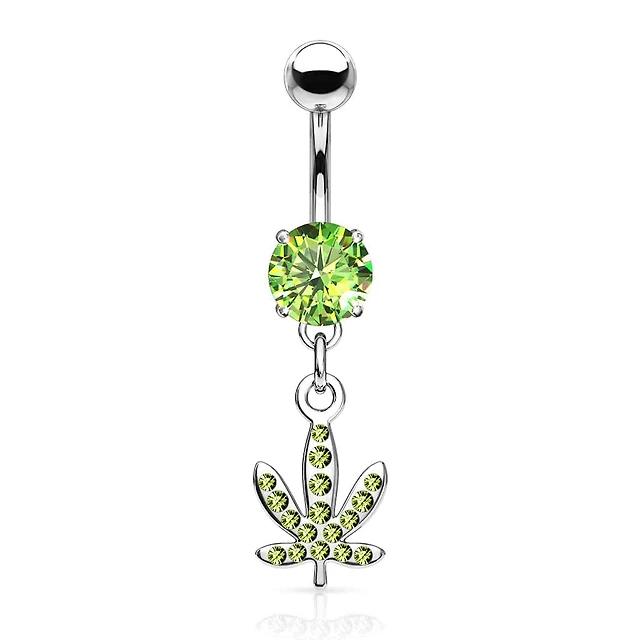 316L Surgical Steel Green CZ Weed Leaf Dangle Belly Ring