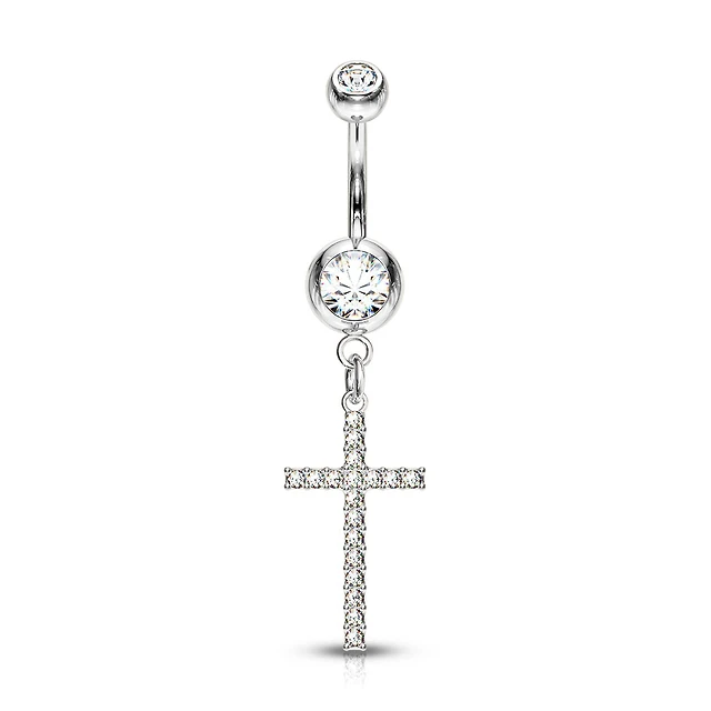 316L Surgical Steel White CZ Thin Cross Dangly Belly Ring