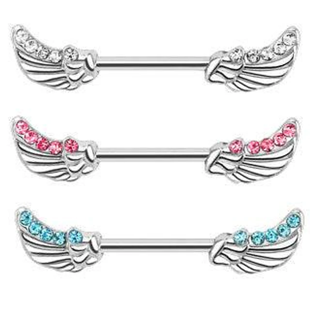 Surgical Steel Nipple Ring Bar with Angel Wing Feathers with CZ Gems