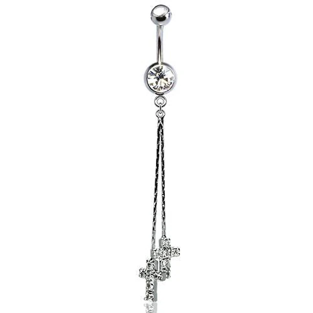 316L Surgical Steel Double Tassel and CZ Cross Dangle Belly Ring