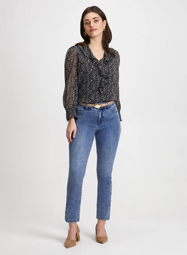 Ruffled Sleeve Chiffon Top & Slim Leg Jeans