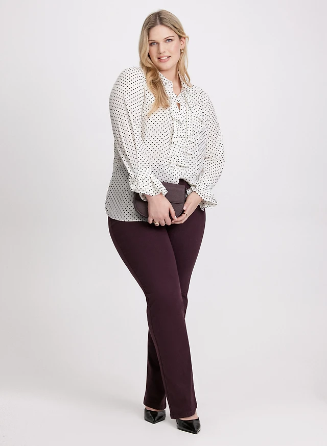 Polka Dot Ruffled Blouse & Rhinestone Straight Leg Jeans