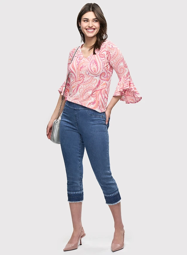 Linen-Blend Fringe Sleeve Blouse & Embroidered Hem Capri Jeans