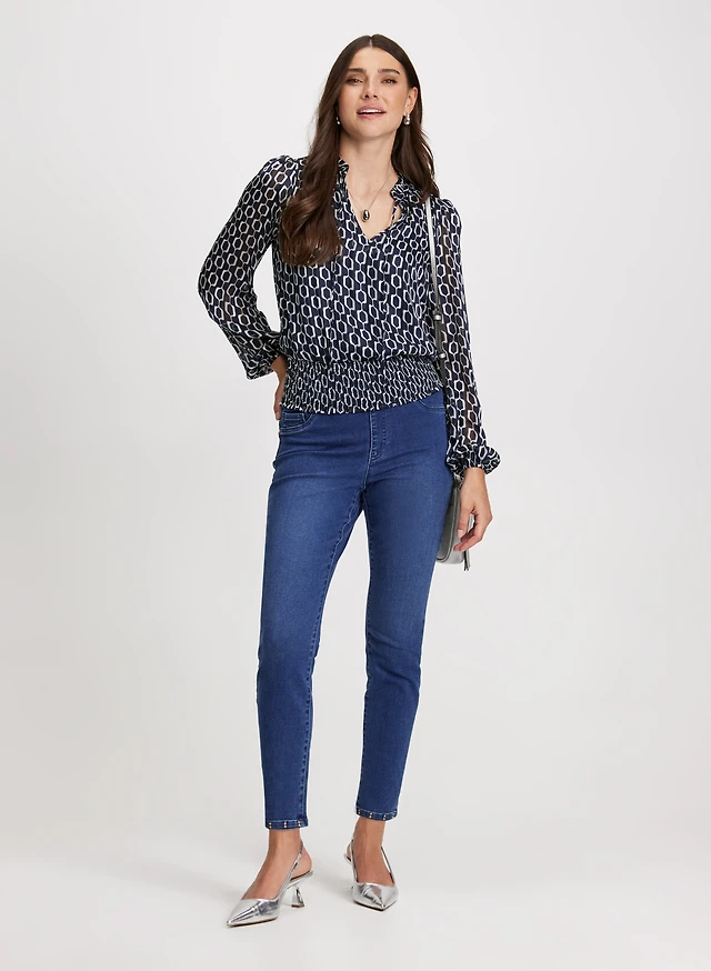 Smocked Waist Geometric Print Blouse & Pull-On Slim Leg Jeans