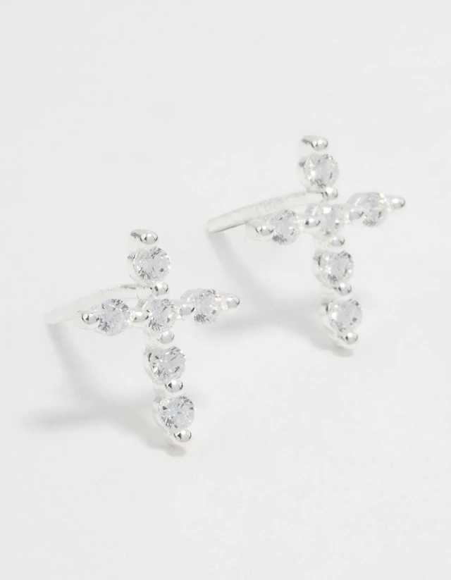 Sterling Silver Mini Cubic Zirconia Cross Stud Earrings