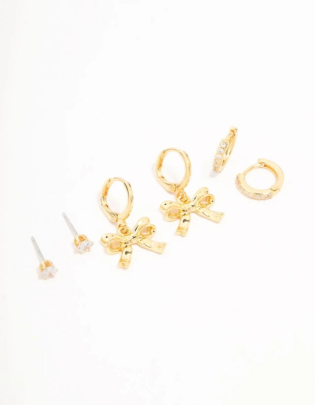 Gold Plated Brass Bow Drop & Cubic Zirconia Huggie & Stud Earrings 3-Pack