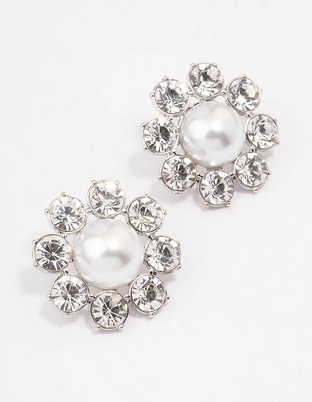 Silver White Flower Diamante Stud Earrings