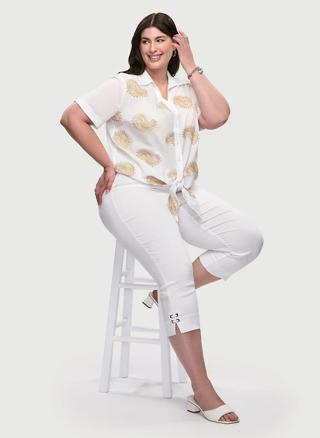 Paisley Embroidered Tie-Front Blouse & Pull-On Slim Leg Capris