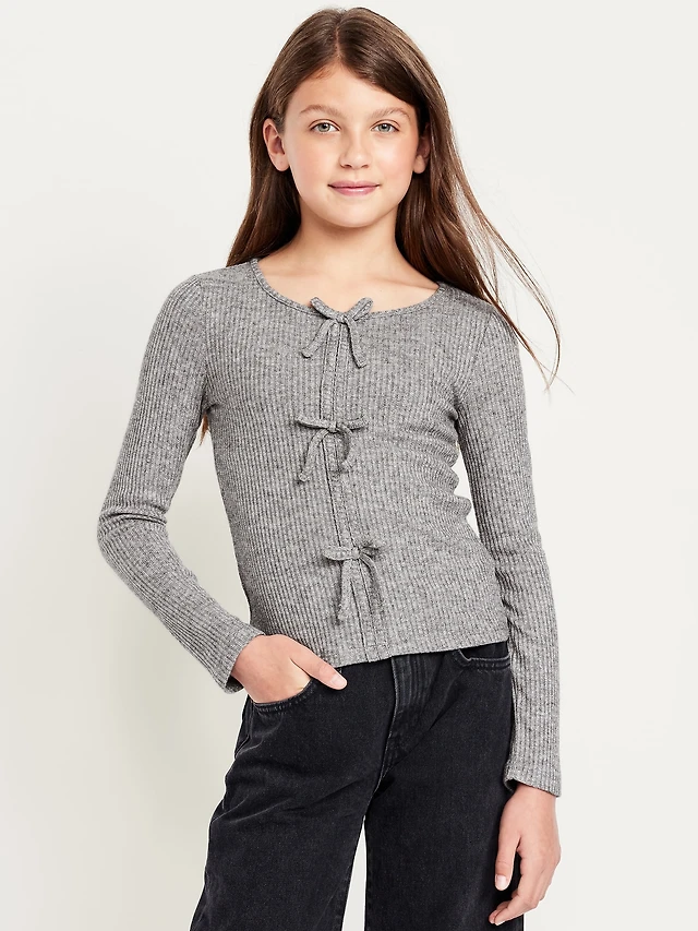 Fitted Long-Sleeve Lace-Tie Ribbed T-Shirt for Girls