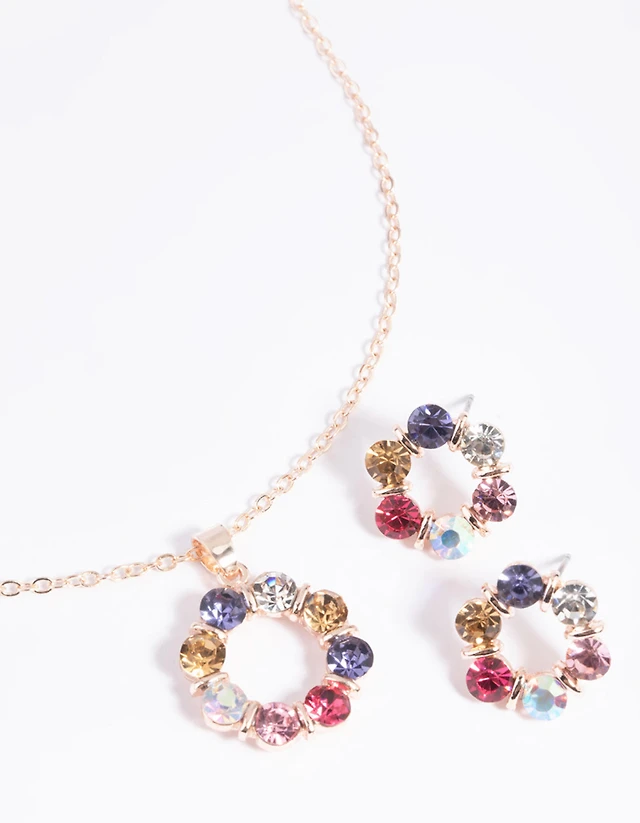 Gold Pearl Diamante Circle Necklace & Earrings Set