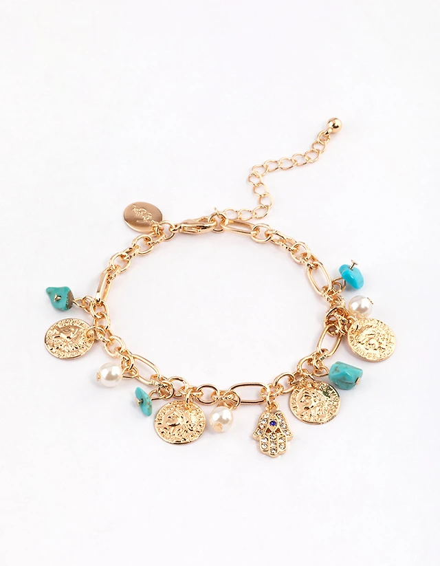 Gold Mixed Stone Coin & Hand Motif Necklace