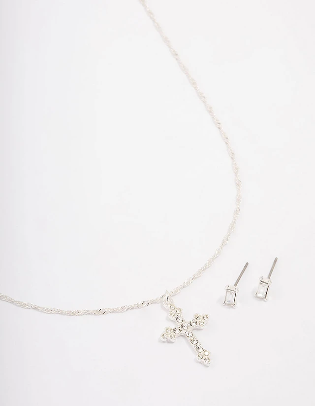 Silver Plated Diamante Cross Pendant Necklace & Stud Earring Set