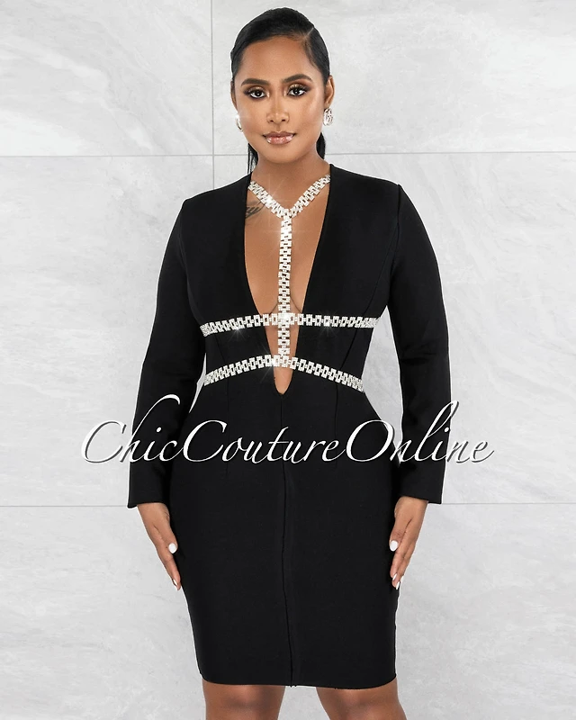 *Reneta Black Deep V Rhinestones Décor Bandage Dress