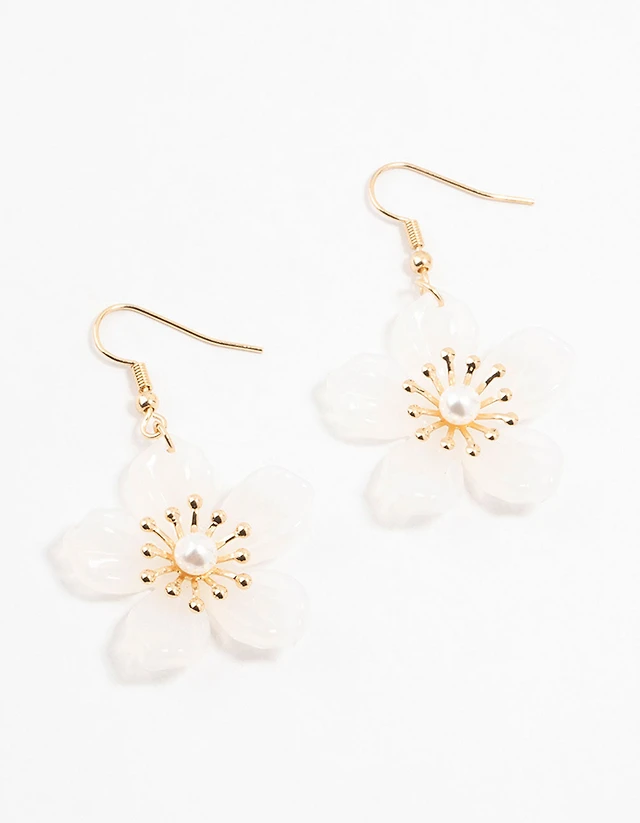 White Acrylic Spikey Flower Pearl Drop Earrings