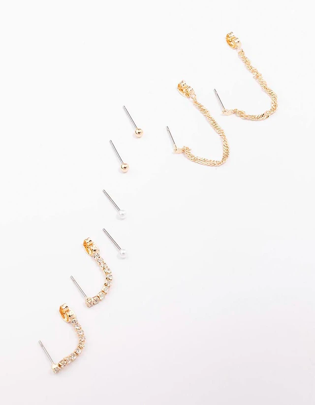 Gold Stud & Chain Diamante Earrings 8-Pack
