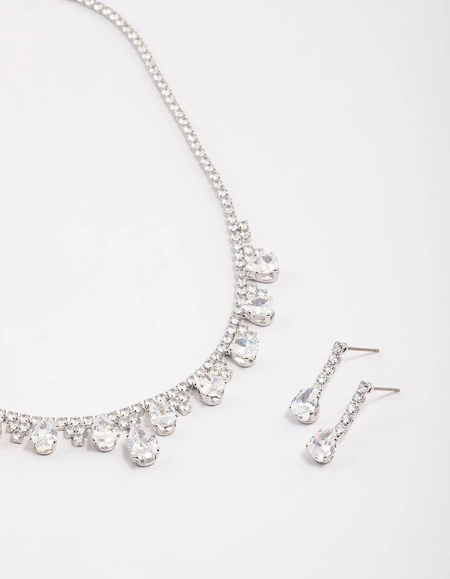 Silver Cubic Zirconia Cup Chain Teardrop Earrings & Necklace Set