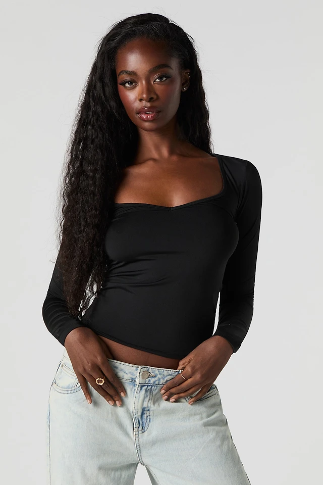 Ribbed Scoop Neck Curved Long Sleeve Top