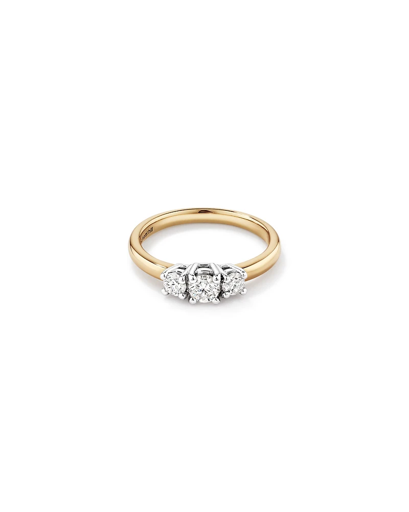 A timeless tribute to love, this elegant 14 karat yellow and white gold three stone engagement ring showcases a shimmering 0.25 carat centre round brilliant diamond, complemented by two 0.13 carat side stones, all of I2 clarity and HI colour. All are expertly prong-set. This piece is backed by our Michael Hill Diamond Warranty.