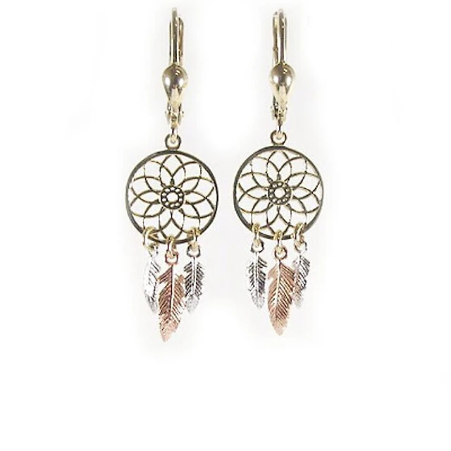 10K Yellow, White & Rose Gold Dream Catcher Dangle Earrings