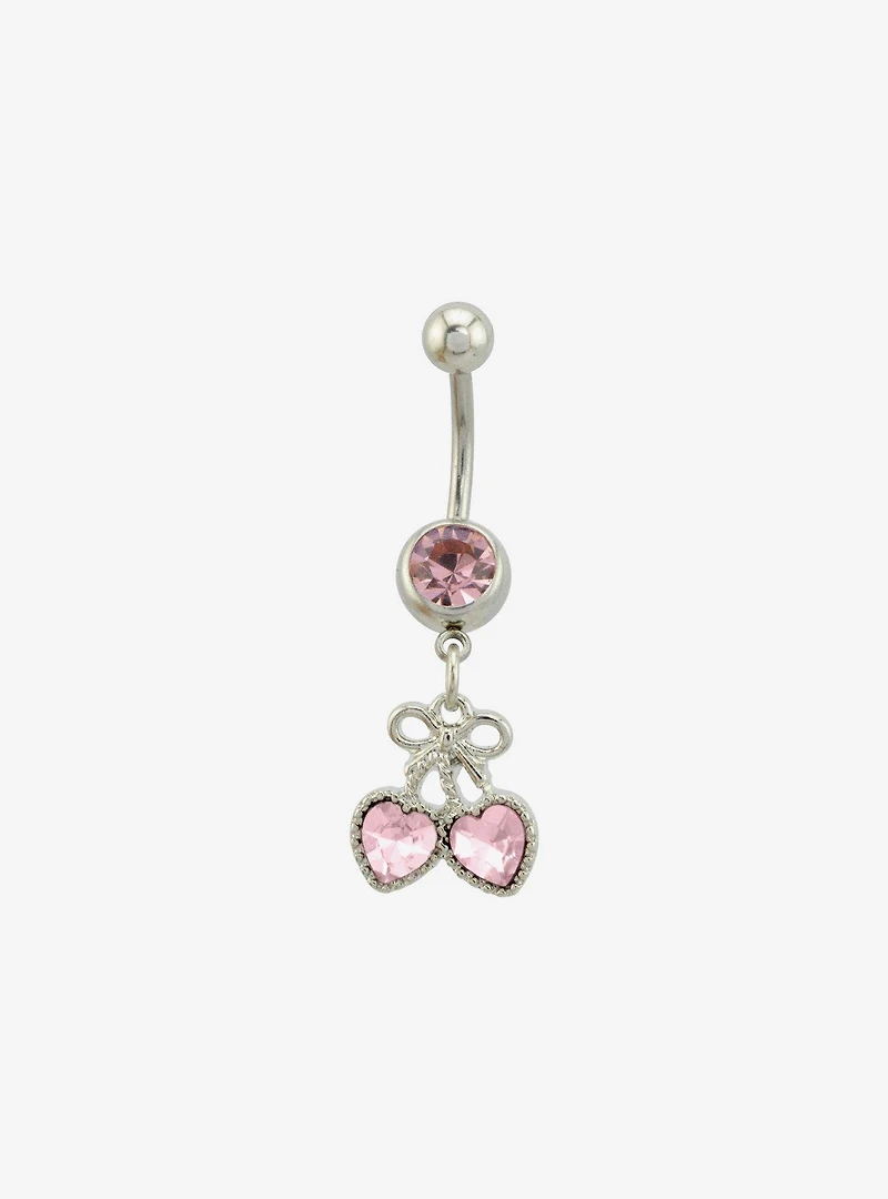 Silver-tone navel barbell with a dangling bow and heart-shaped cherry charm, plus pink gem accents. Jewelry care:  Wash with antibacterial soap and warm water. Piercing care:  Wash hands thoroughly, then clean piercing with H2Ocean (sold separately) or saline solution.