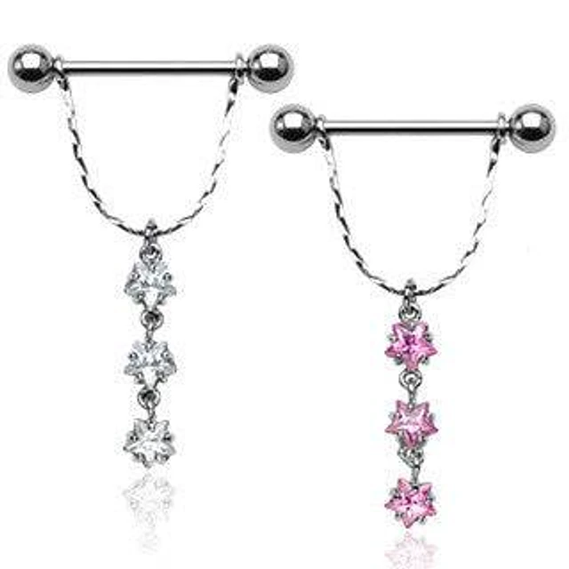 14ga 316L Surgical Steel Triple Star CZ Gem Dangle Nipple Ring Barbell
