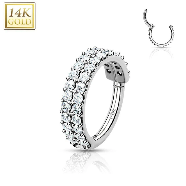 14KT Solid Gold 2 Row White CZ Ear Cartilage Hinged Clicker Hoop