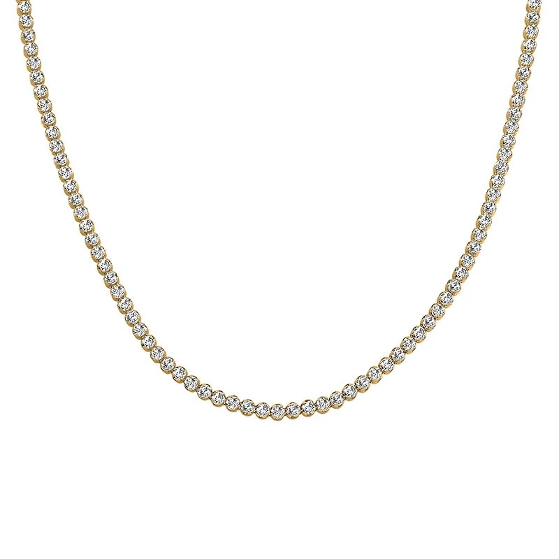 The consistent arrangement of stones in this tennis necklace creates a look of refined elegance that you can wear alone or make a statement by layering it The consistent arrangement of stones in this tennis necklace creates a look of refined elegance that you can wear alone or make a statement by layering it with other necklaces. Thoughtfully designed with a 2 inch extender so you can adjust it to compliment your current stack or outfit of the day. Crafted in Gold Plated Sterling Silver to add a brilliant luster that will make these pieces show-stopping and maximize the sparkle of the cubic zirconia. Cleaning and Care Cleaning: Soak briefly in jewellery cleaner or a mild solution of soap and warm water, then rinse and gently polish with a soft cloth. Professionally clean periodically (every six months for jewellery set with gemstones). Storage: Store pieces separately in a fabric lined case or jewellery box, like our Genuine Leather Jewellery Travel Case with compartments, or in chamois bags, so they do not get scratched. Cautions: Do not wear while doing home cleaning, gardening, or other types of manual labour, or while sleeping. Do not wear while bathing, showering, swimming, or using a hot tub or sauna. Do not expose to household cleaners, especially those containing bleach. Do not expose to cosmetics, perfumes, sunscreens, lotions, and hairspray/hair gel. Apply these first and let them dry before wearing fine jewellery. Do not use paper towels or tissues to dry — they can scratch. If visible scratches or damage appears, bring pieces in for professional care (repair, polishing, re-plating). Use only a very soft brush to clean pieces when needed (i.e., the brush that comes in our Jewellery Care Set) to prevent scratching.