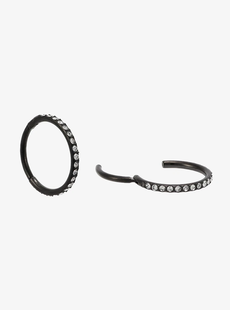 Set of 2 black-tone hinged clickers with clear CZ detailing. Jewelry care: Wash with antibacterial soap and warm water. Piercing care: Wash hands thoroughly, then clean piercing with H2Ocean (sold separately) or saline solution.