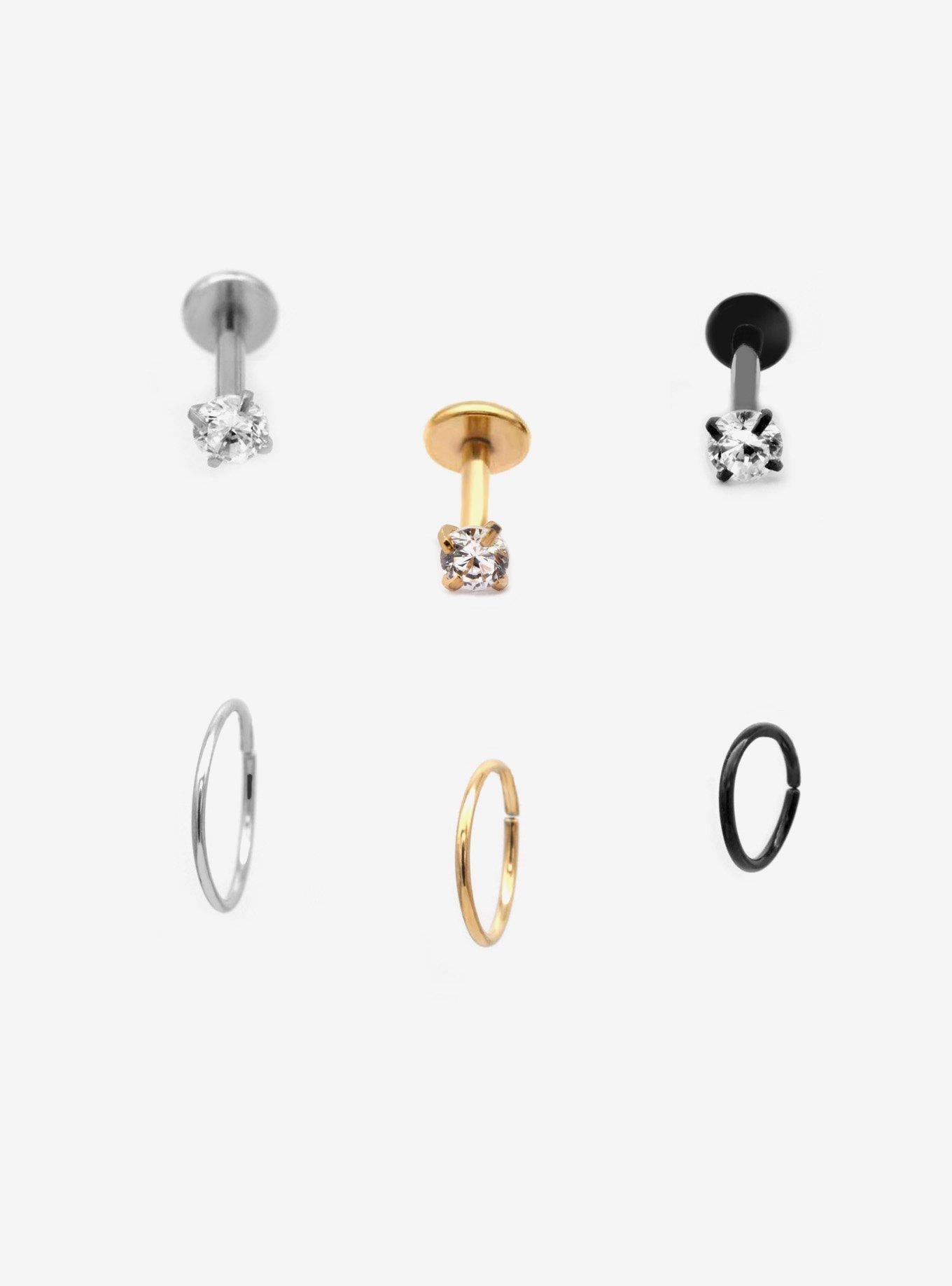 Mixed metal set including 3 labret studs with gem detailing and 3 hoops in silver-tone, gold-tone and black-tone. Jewelry care: Wash with antibacterial soap and warm water. Piercing care: Wash hands thoroughly, then clean piercing with H2Ocean (sold separately) or saline solution.