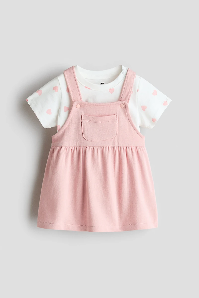 Soft set with an overall dress in sweatshirt fabric and a top in jersey. Overall dress with wide shoulder straps with snap fastener, an open bib pocket, and gathers above a flared skirt. Short-sleeved top with a printed pattern, round neckline, and snap fasteners on one shoulder (sizes 2–4Y without snap fasteners).