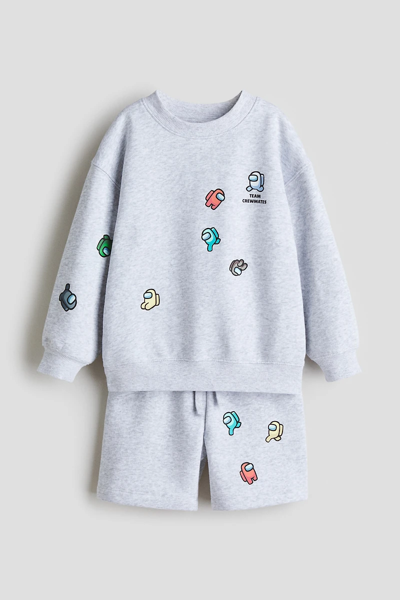 Set with a sweatshirt and sweatshorts, both with a printed motif and soft, brushed inside. Sweatshirt with a round neck, dropped shoulders, long sleeves, and ribbing at neck, cuffs, and hem. Shorts with an elasticized, drawstring waistband.