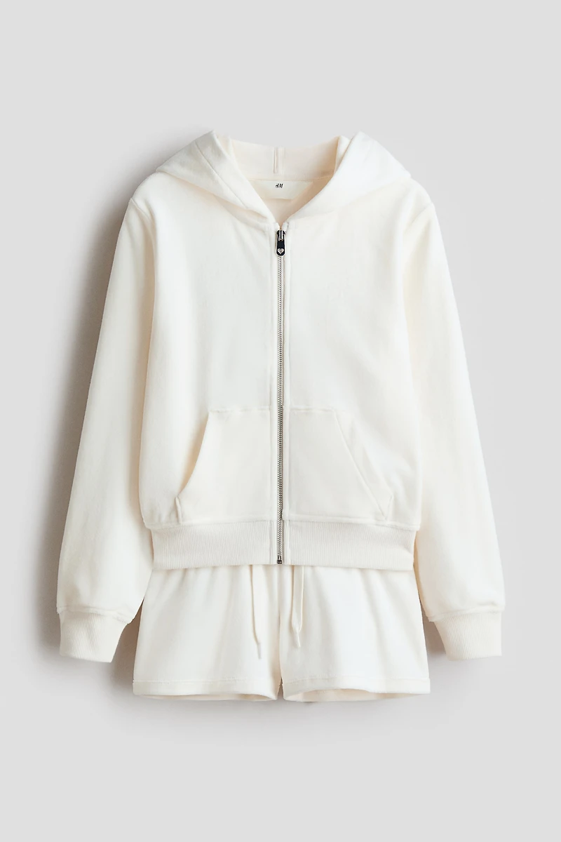Set in soft velour with a hooded jacket and matching shorts. Jacket with an unlined hood, zipper at front, open front pockets, gently dropped shoulders, long sleeves, and ribbing at cuffs and hem. Shorts with wide ribbing, a drawstring, and concealed elastic at waistband, and patch back pockets.