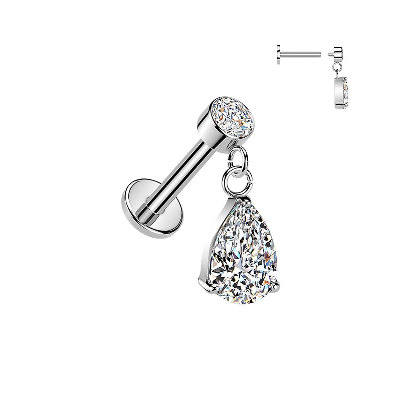 316L Surgical Steel White CZ Teardrop Dangle Internally Threaded Flat Back Labret