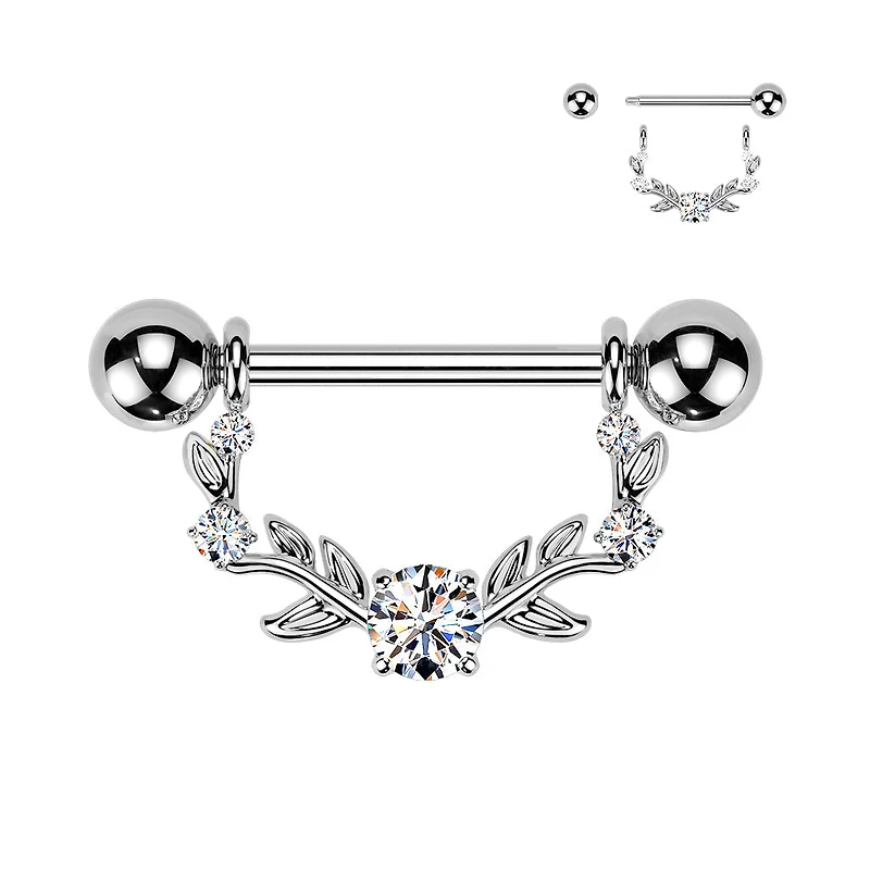 316L Surgical Steel White CZ Vine Shield Nipple Ring Straight Barbell
