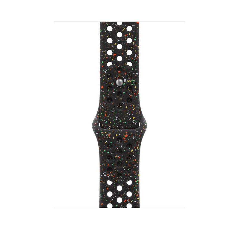Made with compression-moulded perforations for breathability, the Nike Sport Band is durable and strong, yet surprisingly soft. It features colourful flakes that create a randomised pattern, making each strap completely unique. The smooth, dense material drapes elegantly across your wrist and feels comfortable next to your skin. A new aluminium pin-and-tuck closure gives the pin a fresh matt finish. This strap contains at least 32% recycled fluoroelastomer, with each flake containing at least 66% recycled fluoroelastomer.