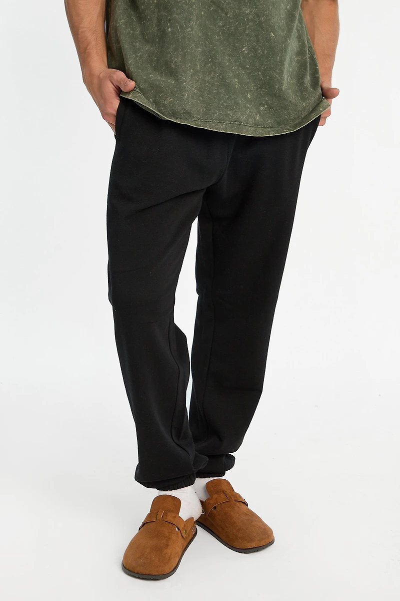 Knit fleece. Sweatpants with a relaxed fit throughout. Elastic cinch leg cuff. Sits on waist with a 29" inseam. Small branded embroidery by pocket seam. Details• Knit• Fleece• Screen print graphic• 2 side slant pockets • Elastic waistband• Imported• Style: 6307-2601 Fit• Sits on waist• Relaxed fit with cinched cuffs• Approx. Inseam: 30.5"• Model height: 6'0", wears a size: M Care & Materials• 65% Polyester, 35% Cotton• Machine wash cold. Hang to dry or tumble dry low.