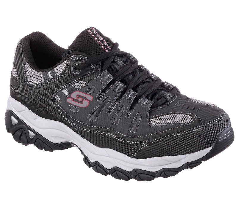 A classic sneaker gets even greater comfort with the SKECHERS After Burn Memory Fit - Reprint shoe. Smooth leather and synthetic upper in a lace up athletic sporty training sneaker with stitching, overlay and perforation detail. Memory Foam insole, shock absorbing midsole, durable rubber outsole.FEATURES & SPECSConstructionSmooth leather upperSynthetic overlaysLace up athletic sporty training sneaker designStitching accentsMicroperforated synthetic underlay panels for cooling effectContrast colored textured synthetic side and heel overlay detailFront perforation vents for coolingSide S logoEmbossed side detailingLace up front with metal top eyeletPadded collar and tongueSoft fabric shoe liningMemory Foam full length cushioned comfort insoleArticu-Lyte supportive shock absorbing lighter weight midsole designClassic style 1 1/2 inch fuller athletic heelFlexible rubber durable high traction outsole