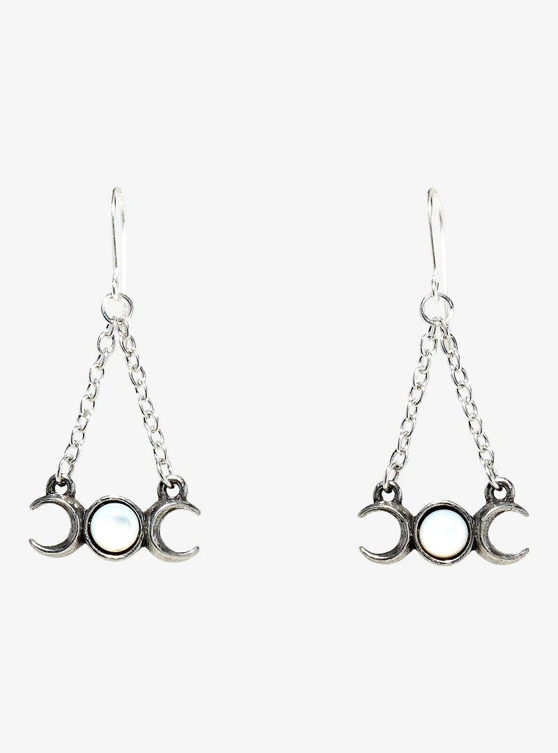 Channel your witchy side with these drop earrings from Alchemy of England! Featuring chain drops with a triple moon design and a pearlescent gem in the center.