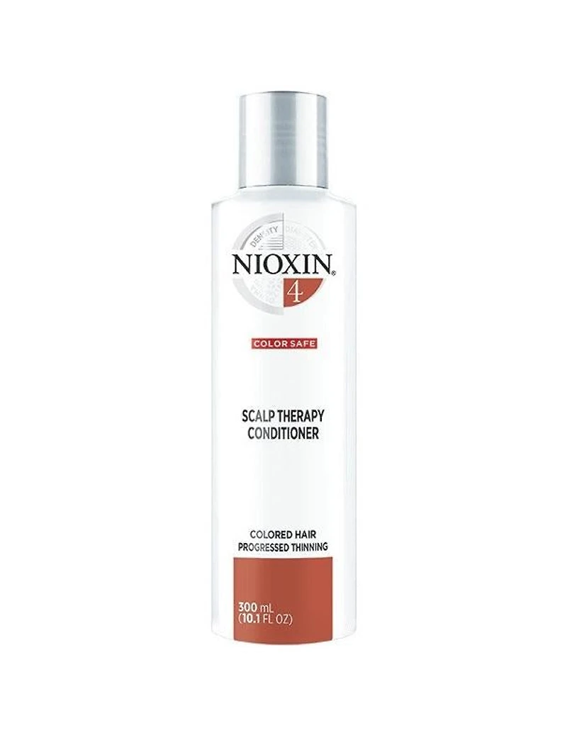 Après-shampoing Nioxin System 4 Scalp Therapy - 300 ml Nioxin System 4 Scalp Therapy pour cheveux visiblement clairsemés, fins et traités chimiquement. Un après-shampoing léger qui contribue à la résilience des cheveux et à leur équilibre hydrique. Technologies: Système de distribution d'accès au cuir chevelu avec vitamines, plantes, écran solaire SPF 15 et agents purifiants pour aider à éliminer le sébum obstruant les follicules et les résidus environnementaux du cuir chevelu, tout en aidant à fournir une protection solaire au cuir chevelu. BioAMP avec des acides aminés de cystine et des ingrédients légers de conditionnement et de traitement ; aide à donner des cheveux d'apparence plus épaisse en augmentant la plénitude de chaque mèche de cheveux et en réduisant la perte de cheveux en les renforçant contre les dommages et la casse. Glyco-Shield pour cheveux et cuir chevelu traités chimiquement avec extrait de thé blanc, humectants, huile de menthe poivrée et agents revitalisants protecteurs qui offrent une technologie de double bouclier pour aider à fournir une protection et un équilibre hydrique aux cheveux colorés, tout en laissant le cuir chevelu rajeuni et rafraîchi.