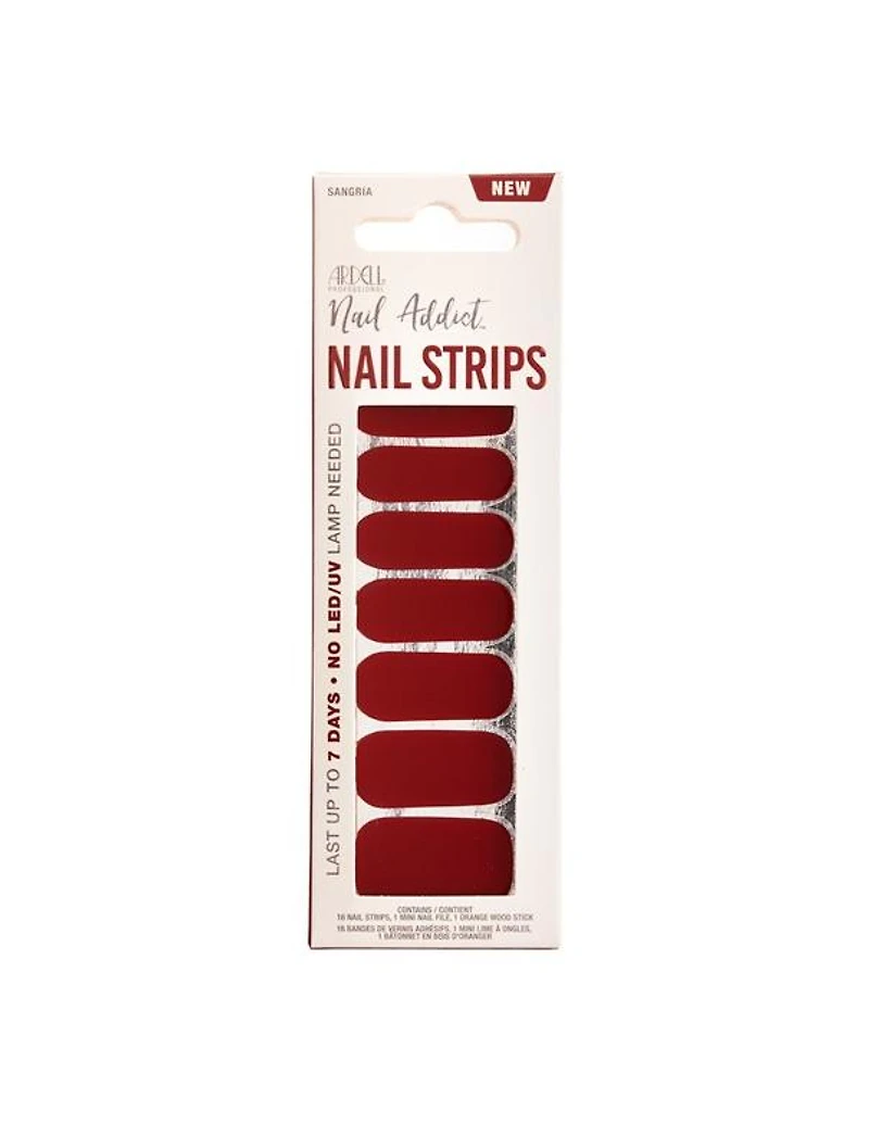 Ardell Nail Addict Nail Strips Sangria Unleash nail royalty with Regal Red nails. Made from real nail polish, Ardell Nail Addict Nail Strips in Regal Red are nail strips that are flexible, easy to apply, and can last up to 7 days. No LED/UV light or special tools required. Removal is fast, easy, and non-damaging to the natural nail. Get nails fit for majesty– flawless and mess-free! High shine finish Can last up to 7 days No LED/UV lamp needed Gentle on natural nails Easy to apply & remove Kit Includes: 16x nail strips 1x mini dual sided nail file 1x orange wood stick