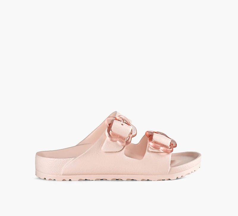 - Floral buckles add playful detail