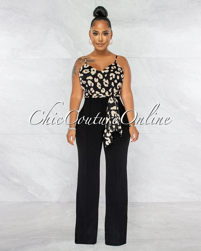 *Aubrey Black Nude Leopard Print Silky Top Two-Tone Jumpsuit