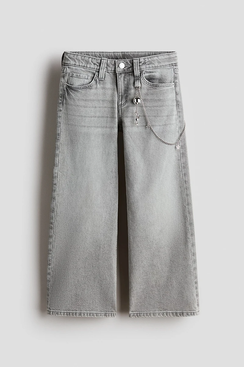 5-pocket jeans in washed denim with decorative details. Baggy fit through hip and thigh. Low waist, adjustable elastic at waistband for best fit, and zip fly with button. Dropped gusset and flared legs.