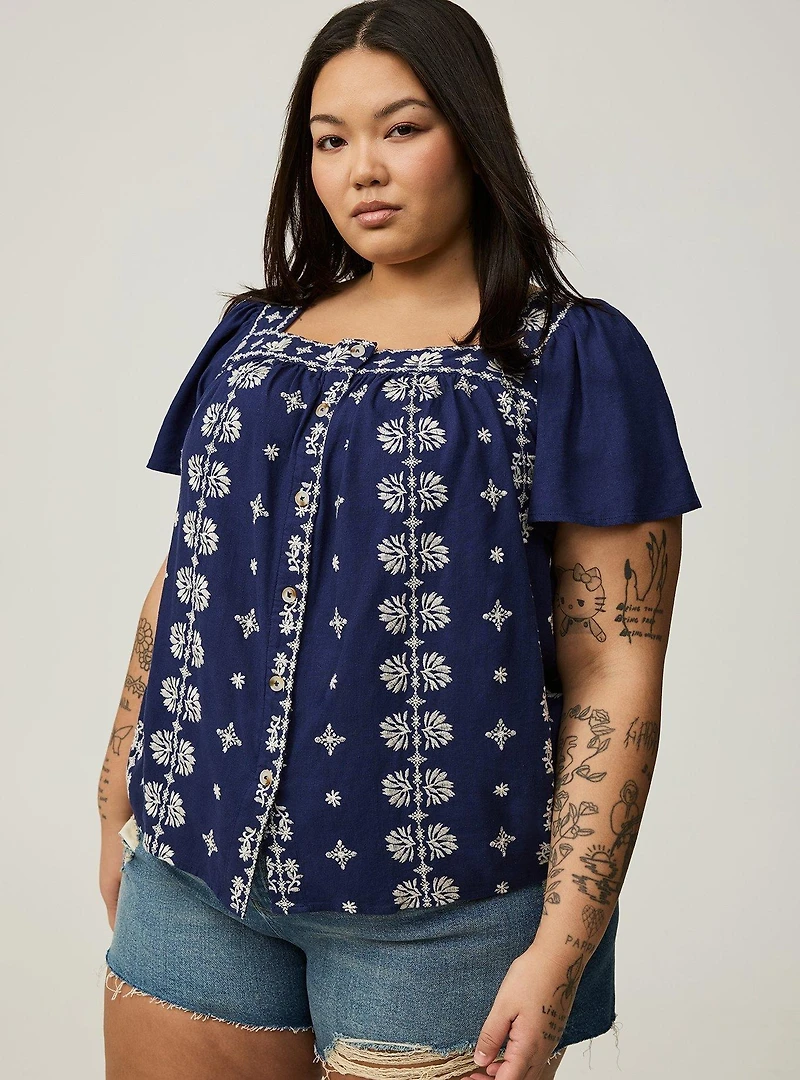 FIT Measures 28'' from shoulder (size 2). MATERIALS + CARE Beach linen woven fabric. 100% cotton. Machine wash cold. Tumble dry low. Imported. DETAILS Square neckline. Short sleeves. Embroidered details. Eyelet trim.